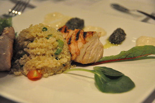Hoofdgerecht: quinoasalade met gegrilde gepekelde kalkoen, lavasmayonaise en pesto van citroenmelisse